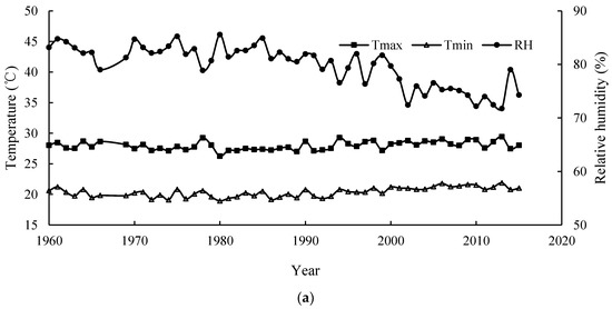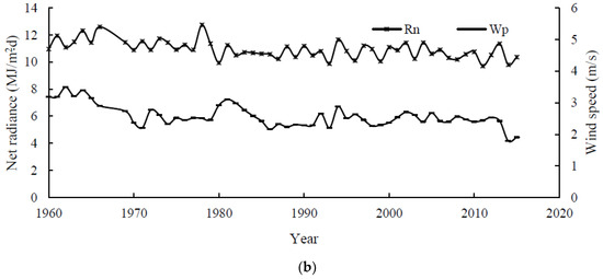 Meteorological data covering the years 1960–2015 (of which 1967 and 1968 are missing) were obtained from the Gaoyou Meteorological Station. These data mainly include hourly rainfall, daily rainfall, daily maximum temperature, daily minimum temperature, daily humidity, daily atmospheric radiation, daily wind speed and wind direction. Average daily meteorological values used in reference crop evapotranspiration (ET0) calculation from 1960 to 2015 is shown in Figure 2.