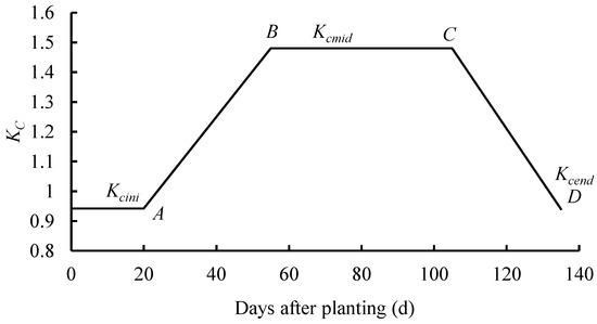 The reference crop evapotranspiration on day t (ET0t) was calculated using the FAO56 (Food and Agriculture Organization Irrigation and Drainage Paper No. 56) Penman–Monteith equation; the crop coefficient (Kct) is a function of the crop growth period as proposed in FAO56 [32] and shown in Figure 3 [33]. The potential evapotranspiration for the paddy field on day t (ETt) was calculated using the following formula: