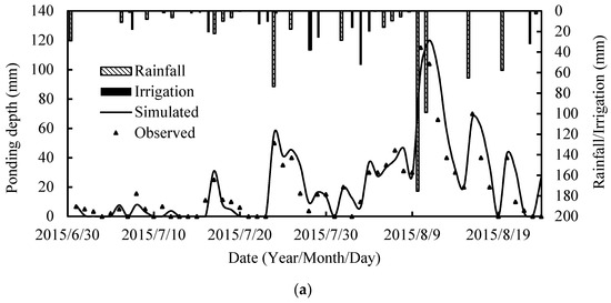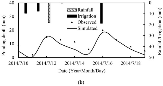 On the basis of the experimental data collected in 2014 and 2015, the model was calibrated using the measured values of water-balance components obtained in 2015 and validated using the observations obtained from 10–19 July 2014. Following this verification process, the final values of parameters K0 and α were 0.2 m/d and 180, respectively and the average percolation rate of the paddy field was calculated to be 3.7 mm/d, which is consistent with the average percolation of single-season semilate rice planted in clay loam [36].
