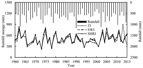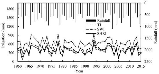 Moreover, SWI and SHRI serve to increase the storage ratio and reduce the irrigation amount in the same hydrological year, with SHRI consistently saving a greater amount of irrigation than SWI (in Table 5). The dry-year average irrigation amounts under the TI and SHRI scenarios were 755.1 mm and 462.4 mm, respectively, suggesting that SHRI could reduce irrigation amounts by 38.8% in comparison to TI. The average irrigation amount for the 54 years calculated for SHRI mode was 60 mm less than that for SWI and 270 mm less than that for TI, suggesting that SHRI has high water-saving potential.