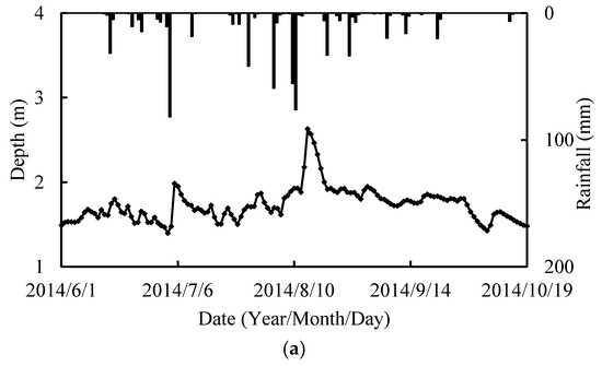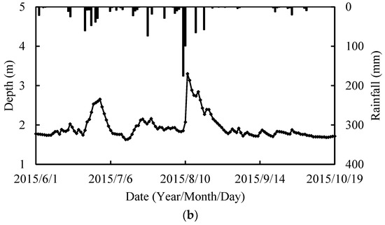 The amount of water stored in the Zhongshi River is stabilized over time and can be operationalized for reuse. The water depths of the river during the rice growing season of 2014 and 2015 are shown in Figure 7a,b, respectively. The average, minimum and maximum water depths of the river were 1.73 m, 1.40 m and 2.63 m in 2014 and 1.93 m, 1.63 m and 3.30 m in 2015. Taking a water depth of 0.8 m to be the lower limit necessary for rice production, the potential amount of water that could be reused is approximately 27,700 m3, based on the size of the river at a depth of 1.8 m. Such an amount could potentially irrigate 92.3 ha of paddy fields with a ponding depth of 30 mm.