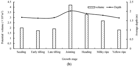 The average water depth and the estimated potential volume of recycled water at different rice growth stages for the years 2014 and 2015 are shown in Figure 8a,b. The figures show that the average water depths of the Zhongshi River during the jointing–booting stage in 2014 and 2015 were 2.02 m and 2.37 m, respectively, which were the highest in the entire growth period. In 2014, the amounts of water potentially available for reuse at the jointing–booting stage and the late tilling stage were 4.21 million m3 and 1.92 million m3, respectively; in 2015, they were 6.74 million m3 and 3.65 million m3, respectively. The jointing–booting stage is a critical period of water use for rice characterized by high transpiration and high-water requirements [37]. Taking full advantage of the potential to recycle water at the jointing–booting stage not only helps meet the demand for water at this stage but also serves to save water. For example, in 2015, the amount of water available for reuse was 67,400 m3 at the jointing–booting stage, which lasted 21 days from August 6 to August 26. During this period, rainfall was high and frequent. According to the records of irrigation collected in the field, irrigation was conducted only once on August 24 at the latter part of the jointing–booting stage. If the amount of reserved water in the river were used for irrigation, it would have been sufficient to irrigate an additional 224.7 ha of paddy fields assuming irrigation water layer of 30 mm. Such an area is approximately 1/4 of the controlled area of the Zhongshi River. Thus, recycling river water for irrigation could reduce the volume of the surface water diversion and provide flexibility in the water budget to allow for rainfall storage.