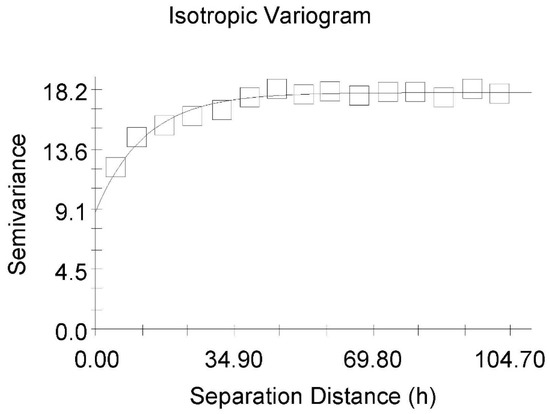The spatial dependency of sampling points separated by lag distance/separation distance h is given by the experimental variogram. It is expressed by the semivariance at a given lag h. The semivariance model is shown by Formula (4):