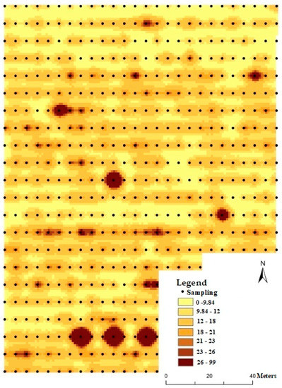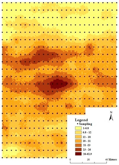 It is impractical to collect soil samples for adequate assessment of soil moisture that represents both spatial distributions at the field-scale and temporal dynamics across the growing season because it is laborious and time-consuming. Consistency and early assessment of soil moisture is vital for crop production. An optimal spatial sampling scheme to reduce sampling density and estimation of unsampled values can save time and money significantly [23]. However, the effectiveness of sampling relies on the accuracy of the spatial interpolation used to determine the spatial variability. Geostatistics provide descriptive tools such as kriging to directly implement property prediction at an unsampled location according to known data points within a local neighborhood; they can be used as an alternative to predict regional variables [24,25]. Grid-based sampling increases with the variogram range and spatially structured variance [26], and the prediction accuracy of soil moisture may improve with advances in computerization. Summarily, the method has the drawback of smoothing effects for the prediction of regional variables. Use of geostatistical methods can optimize irrigation management [1].