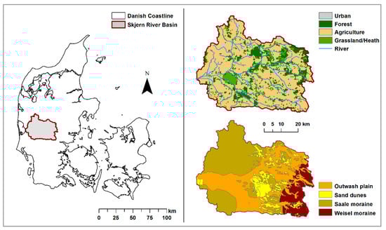 The Skjern River has a basin area of ~2500 km2 covered by mostly sandy soils (Figure 1) and dominated by agriculture (71%) and forest (15%) []. The maximum altitude in the basin is 130 m and annually averaged precipitation is around 1000 mm []. The monthly mean temperatures vary between 2 and 17 degrees Celsius whereas the annual mean streamflow is around 475 mm [].
