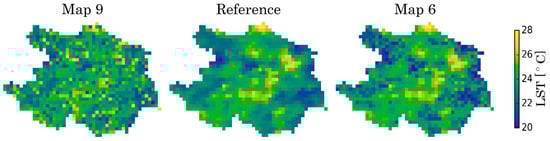 Two synthetic land surface temperature (LST) maps for the Ahlergaarde sub-basin of Skjern to compare the spatial metrics. Map 9 (left) was generated using a noisy perturbation, while map 6 (right) was more similar to the reference map (middle).