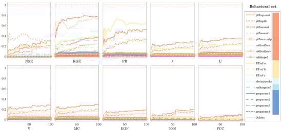 In total, we executed mHM about ~11,800 times in forward mode using the parameter estimation tool PEST []. This is because we ran the model ~4700 times (47 parameters × 100 LHS-OAT) for random and ~4700 times for behavioral initial sets and performed an additional ~2400 runs for the selection of a behavioral set as described above. Figure 3 shows the average accumulated relative parameter sensitivities over the 100 behavioral (NSE > 0.5) initial parameter sets and one-at-a-time parameter perturbations. The average accumulated relative parameter sensitivities became stable, i.e., unchanging parameter ranking, after ~20 initial parameter sets were used in LHS-OAT. Relative sensitivities were normalized values by the highest sensitive parameter. Therefore, the most sensitive parameter resulted in one. It should be noted that we only show the results of behavioral initial sets as they are similar to those from the random initial sets. Here, the colored lines show the most important parameters. Other parameters are presented in gray color only. One of the soil moisture related parameter (rotfrcoffore) is always the most sensitive parameter for all objective functions except for KGE, where one parameter of the PTF, i.e., related to sandy soils, is the most sensitive one as compared to the other 47 parameters of mHM. The rankings of important parameters are converged and similar for all spatial objective functions, while different parameters are highlighted using streamflow-related objective functions. The five most sensitive parameters based on spatial objective functions are soil-moisture-related, PTF, and ET-related parameters. Further, ETref-a parameter seems to be the second most important parameter affecting streamflow dynamics of the Skjern River model (see PB at Figure 3 and Figure 4), whereas another PTF parameter is ranked as the second most important parameter affecting KGE (Table A1).