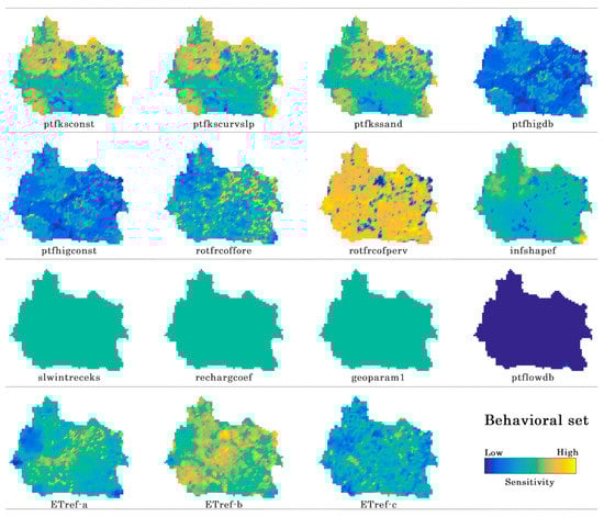 Average of 100 sensitivity maps (entire Skjern Basin) based on the difference between 100 behavioral (NSE > 0.5) initial parameter sets and one-at-a-time parameter perturbations (100 runs per parameter).