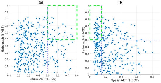 Figure 5 illustrates the simulated spatial AET performance as a function of streamflow model performance based on 1700 randomly generated parameter sets only constrained by the parameter bounds and evaluated against observed streamflow and spatial patterns of AET. Only the results of 329 parameter sets from 1700 total random sample resulting a minimum NSE of 0.0 are shown in these two plots, i.e., the left plot shows NSE vs. FSS and right plot shows NSE vs. EOF. In the generalized likelihood uncertainty estimation (GLUE)-based uncertainty analysis framework, numerous random parameter sets are sampled and, from those, only the parameter sets that deliver a performance level that is above a predefined minimum threshold are retained and classified as behavioral models []. As a rule of thumb, 10% of the random parameter sets should be behavioral. Demirel et al. [] generated 120,000 parameter sets for a conceptual hydrologic model and around 10,000 (~9%) parameter sets were selected using a threshold, i.e., NSE above 0.4. This performance measure has been widely used in rainfall-runoff model optimizations and subsequent GLUE studies. Additional performance measures can constrain the solution space and decrease the number of behavioral models. Wambura et al. [] showed that while 100 out of 1000 random parameter sets satisfied the hydrograph performance evaluation based on NSE above 0.65 threshold, only 80 behavioral models could be identified with two performance measures, i.e., NSE and index of volumetric fit. Similarly, in this study, the behavioral models from a discharge criterion (NSE above 0.5) exhibited very different spatial AET performances, varying from ~0.1 to ~0.8 for both FSS and EOF (Figure 5). Using a simple 10% (~35 parameter sets) cutoff provided a subjective threshold value of above 0.5 for FSS and below 0.15 for EOF. Together with NSE above 0.5, these two thresholds enabled the identification of a more robust selection of behavioral model regions, shown with a green box shown in Figure 5. It should be noted that the number of runs that satisfy both spatial metrics and NSE is 20, which is considerably less than using only one spatial metric. Both spatial metrics clearly indicate that the set of behavioral models is narrowed considerably by adding spatial patterns to the definition of combined behavioral threshold. Therefore, inclusion of MODIS AET to the sensitivity analysis only improves the quality and robustness of the behavioral model selection. Moreover, the results from Figure 5 illustrate the potential of spatial pattern evaluation to discriminate between behavioral parameter sets from more than a pure NSE perspective and how it can minimize equifinality issues.