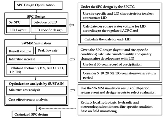 SPC design optimization is an evaluation of all potential SPC design options that meet the ACRC requirement set by the SPCTG to determine the combination of options that minimize total project costs and that is the most cost-effective. The SPC design options include the effects and costs of the LID methods contained within the plan. The optimization process includes three main steps: (1) The design of a SPC under the SPCTG mentioned above, (2) the simulation and calculation of the changes in runoff quantity and quality using SWMM, also, the data from field monitoring of water quality during 3 March to 7 December 2017, was used to calibrate the SWMM model, and (3) the simulation of the minimum cost and the cost-effectiveness of the plan using SUSTAIN. A flowchart of the SPC design optimization method is shown in Figure 1.