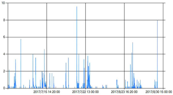 Time series plot of rainfall recorded by an onsite gauge (mm).