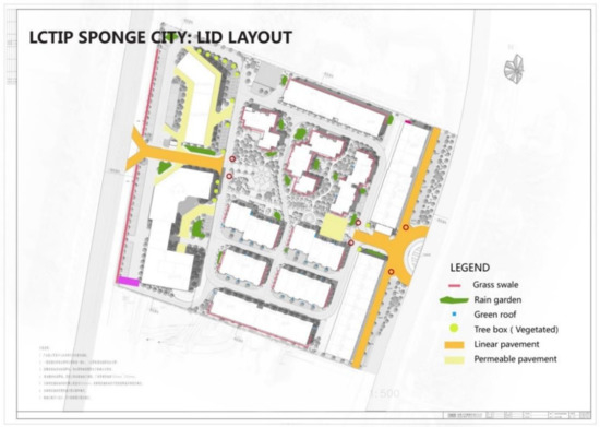 In the present study, an optimization analysis was conducted using the Lincang Technology Innovation Park (LCTIP) as a case study. The LCTIP is the first area of SPC design and construction in Lincang City, Yunnan province, China. It was designed by Shenzhen WALD Urban Design Company (WALD) in March 2016 under the SPCTG. Construction of the project was completed at the end of July 2016. In this case, various types of LID techniques were used given the local soil types and hydrologic, hydraulic, and meteorological conditions. According to the SPCTG requirement, the ACRC is 0.2, which means that 80% of the post-development runoff volume must remain on site. If the calculated ACRC value is more than 0.2, it is necessary to adjust the utilized LID methods until the ACRC is smaller than, or equal to 0.2. In addition to the finished option, referred to as the original scheme (S1), two other schemes were designed for this site under the SPCTG criteria: The landscape improvement scheme (S2) and the minimum cost scheme (S3).