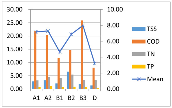 Based on the field monitoring data collected between 3 March and 7 December 2017, four runoff contaminants (TSS, COD, TN, TP) have been significantly mitigated in response to the use of the SPC design shown in Figure 6. In Figure 6, A1 and A2 are inlet points, whereas B1, B2, B3 are outlet points from an area containing dry-land plants, mesic water plants, and fully aquatic (pond) plants. D is the final outlet point where all runoff has flowed through the LID measures. TSS, TN, and TP exhibited lower concentrations than COD. The runoff was light polluted on site. The increase was likely caused by rain gardens and water ponds. After going through the LIDs, the final COD decreased to relatively low levels.