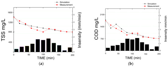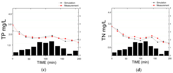 The runoff quality was conducted after completion of LCTIP in July 2016. There are 2 rainwater collection points, a rain gauge set on the rooftop of a building, and one rain barrel set onsite. In addition, 3 runoff collection outlets were established on the site, which allowed for the sampling of runoff waters and the determination of pollutant concentrations and loads. Based on water quality analyses conducted between 3 March to 7 December 2017, the mean pollutant loading from runoff is 3.07 mg L−1 for TSS, 21.09 mg L−1 for COD, 0.93 mg L−1 for TP, and 3.88 mg L−1 for TN. These data were used as input for the SWMM simulation. Two independent rainfall events occurring at 14:20 on 15 July 2017, and at 16:20 on 23 August 2017, were used for model calibration of water quality (Figure 2). The outlet water quality monitoring results are shown in Figure 6.