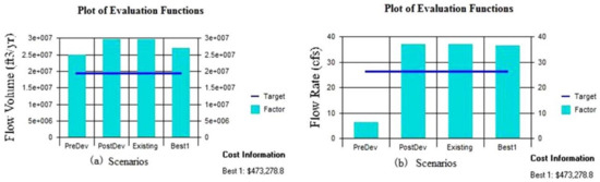 The optimization analysis shows significant differences between the three schemes, although all three designs met the ACRC requirement set in the SPCTG. As previously mentioned, the 10-year event is very significant for the SPC concept; thus, we selected the evaluation factor (a reduction in flow volume), with a 10-year return period for the SPC optimize analysis. The optimization is mainly based on changing various combinations of LID measures toward the control target/evaluation factor; thus S3 was excluded from the optimization analysis.