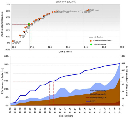 Based on the decision tables, the target value for the cost-effectiveness analysis was assumed to range between 0 and 100 with a 100 m3 s−1 threshold. The search stopping criteria were set as 400 for the maximum number of iterations. The target value range is from 0 to 100%. The cost-effectiveness results for S1 and S2 are shown in Figure 10 and Figure 11. The results indicate that the cost should be $1.37M for S1 when the annual flow volume reduction target was the 37%, and $0.85M for S2 when the annual flow volume reduction target of 28% is met. In addition, the ratio of each LID method used in the various iterative combinations can be acquired (e.g., for S1 in Table 9). The ratio is very helpful because it allows decision-makers to adjust the size of the LIDs used.