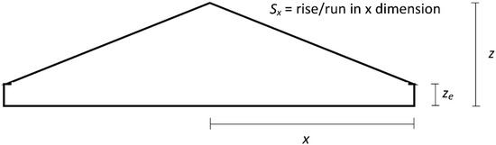 where Q is the volumetric flow rate, vy is the average water velocity downslope, A is the cross sectional flow area, k is a unit constant (1 for SI or 1.49 for US customary units), n is the Manning’s roughness coefficient, Rh is the hydraulic radius equal to A divided by the wetted perimeter, and Sy is the slope (rise/run) of the energy grade line which for this research is assumed to equal the bed slope (Manning [12]; discussed in detail in Chow, [13]). Unlike with most uses of Manning’s equation, for the current scenario the flow is on a planar surface without confining sides. Since Manning’s equation requires an estimate of the flow cross-section, it is assumed that as the water moves downslope, it maintains a triangular cross sectional set atop a small rectangular base with the dimensions labeled as shown in Figure 1. Other similar cross sections were investigated including an arc and various sections of ellipses in lieu of the triangular shape, but these shapes yielded no improvement over the simple cross section shown in Figure 1.