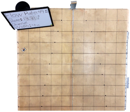 A 2.5 m × 2.5 m sloped wooden platform was constructed for testing. The slope of the platform was modified with jackstands located at its lower edge, and Sy was determined by measuring the height from the floor of the upper and lower edges of the platform along with the known platform dimensions. The top surface of the platform was coated with a latex paint with small amounts of medium sand mixed into it prior to application. This served the dual purposes of sealing the wood surface and slightly roughening the surface with the intent of approximating unfinished concrete. Though concrete will obviously never be used in an infiltration area, this surface is included in the tests to provide validation of the flow-spreading model across a very wide range of n values.
