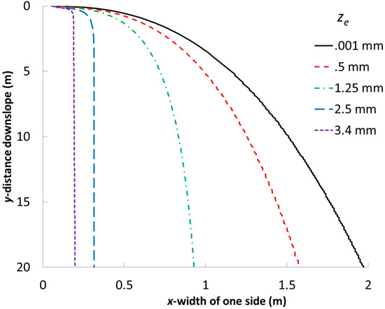 Selection of a value of ze for Equations (2), (3), (5) and (6) was not obvious, as there are not readily published values for this variable as there are for n. Clearly it must be between zero and some reasonable upper limit. If ze = 0, the flow plume will widen without limit as y increases. On the other hand, large values of ze limit the maximum width of the wetted path by reducing Sx. As z approaches ze when y becomes large, Sx approaches zero and no further increase in width is predicted. Simmons et al. [16] describe the depth of spilled fluids on dry concrete and found water puddles had a height of 3.4 mm on flat surfaces. They also describe how the height varies from thinner on upslope portions of puddles compared to downslope portions of puddles. Given the systems modeled—flow on potentially steep slopes, and on a very uneven texture—this study used ze as a fitting parameter limited between 0 and 3.4 mm. Mathematically, the impact of ze can be illustrated by setting z = ze, which reduces Equation (2) to