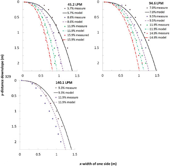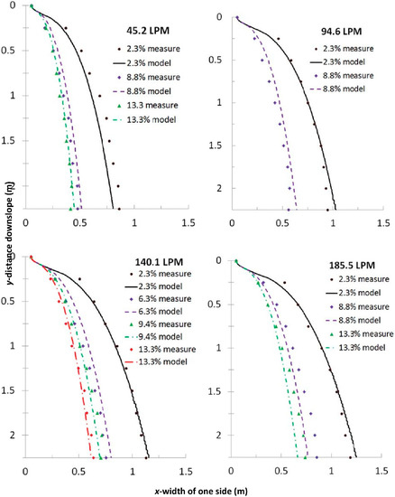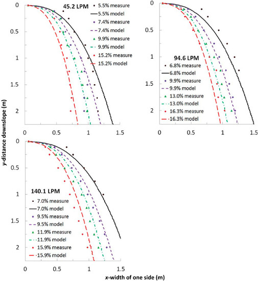 Measured and modeled results of one side of the water spreading onto a roughened painted surface for varying Q and Sy with x0 = 10.2 cm and n varying with slope as per Equation (14). The measured x values are the average of the right and left sides at that value of y.