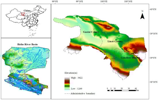 Considering the availability of data, we select the status year (2012), the recent programming year (2020), and the long-term programming year (2030) to be evaluation years for analyzing the WRCC in the Heihe River Basin. Meanwhile, in this paper, three counties in Zhangye in the midstream reaches are chosen as the study area, including Ganzhou, Gaotai, and Linze (Figure 1), which are the main agricultural production regions. The study area is 1.14 × 104 m2, accounting for 7.98% of the Heihe River Basin. In addition, the data are derived from the results of the scheme set for water resource allocation.