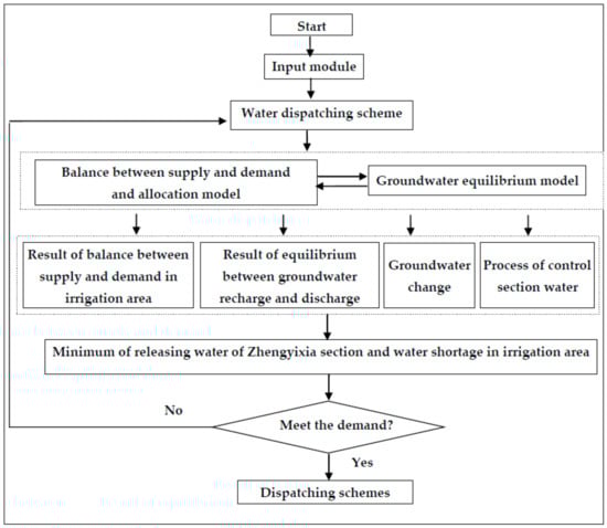 The water resource system of the Heihe River Basin is complex and complete, consisting of surface water and ground water sources such as rivers, reservoirs, and spring water. Therefore, the water transformation characteristics of the Heihe River Basin middle reaches and water balance factors such as river course seepage, spring water discharge, phreatic water evaporation, and canal system field infiltration should be reflected in the Heihe River water resource allocation model to calculate the water balance under different inflow and water consumption scenarios. According to the long series years of the Yingluoxia section inflow on the Heihe River main stream and considering the actual water demand of the middle reaches irrigation area, the runoff process characteristics of the flood season from July to October are combined and several gate closed water transfer schemes of the Heihe River main stream are proposed. Subsequently, taking the water releases in the Zhengyixia section as the control condition and assuming a minimum water shortage in the middle reaches irrigation area, a reasonable water allocation scheme was determined via analysis of the multi-scheme simulation. The water allocation models on the Heihe River main stream primarily included the groundwater equilibrium model of the irrigation area in the Heihe River middle reaches, the water resource balance model between supply and demand and the water resource allocation model. The groundwater equilibrium model was mainly used to calculate groundwater replenishment in different water resource allocation schemes and the release balance. The water resource balance model between supply and demand and water resource allocation model were mainly used to analyze water demand, supply, and shortage in the irrigation area and to calculate water resources. The framework of the water resource model is shown in Figure 2.
