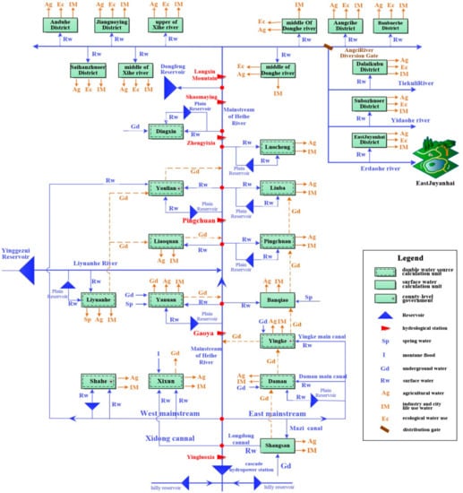 The water resource allocation system of the river basin includes two aspects: water supply and demand. The water supply aspect refers to the water source project and transport route, and the water demand aspect covers urban life, industrial production, agricultural irrigation, ecological maintenance, hydroelectric power generation, and so on.