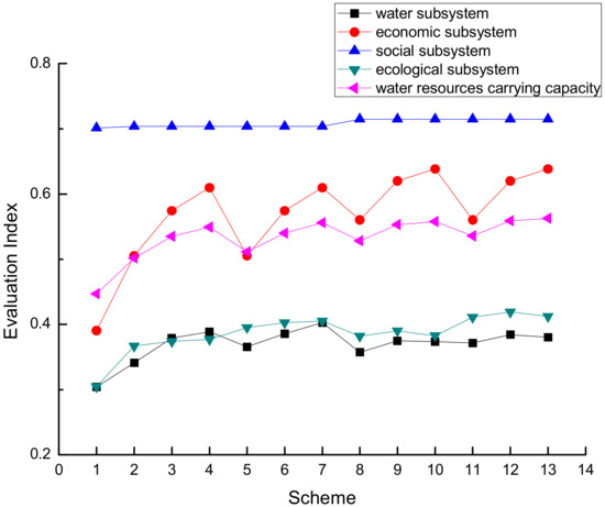 In the water resource subsystem, the evaluation index has gradually increased, and the index of scheme 7 reaches a maximum of 0.4092. This shows that the water resources required for social and economic development are guaranteed and the region still has the potential for development and utilization. The evaluation indexes of water subsystems have declined at the long-term planning level, which is mainly because of the increase in water resource consumption resulting from rapid economic and social development.