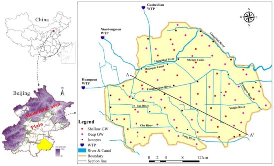 As one of the water shortage megacities in the world, Beijing relies heavily upon groundwater resources for its various usages, over 60% of annual total water supply quantity is groundwater []. Due to long-term overexploitation, groundwater level has declined sharply during the past decades []. In order to alleviate the water shortage, wastewater and reclaimed water have been utilized for agricultural irrigation in Beijing Plain since the 1950s []. Water reuse for irrigation may lead to some negative environmental consequences, such as soil structure deterioration, enrichment of heavy metals and other pollutants in soils and agricultural corps, groundwater pollution as well [,]. Numerous researches have been conducted to get insight into these consequences, but most of them concentrated on the effects on soil and plant [,,,,]. Only a few researches were concerned on the influences of this reuse on groundwater [,,,]. For example, Bao et al. found that long-term wastewater irrigation had resulted in nutrient elements and heavy metals accumulation in soil at some extent, but it did not constitute pollution in shallow groundwater [,]. Wang et al. reported that nonylphenol, a kind of organic pollutant from wastewater, had been found existing in groundwater, and its distribution and concentration in groundwater were related to the measure of wastewater irrigation and groundwater depth []. Niu et al. applied geostatistics to determine the spatial variation of groundwater quality in a reclaimed water irrigation area in Beijing, and found that reclaimed water irrigation was not the major factor influencing groundwater quality []. However, the hydrogeochemical characterization and quality of groundwater in wastewater and reclaimed water irrigation areas are still not well known. This may limit the protection and proper utilization of groundwater resources in Beijing, especially in reclaimed water irrigation areas.
