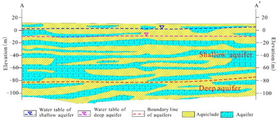 As shown in the Figure 2, the terrain of this area is flat, with a slight gradual slop from northwest to southeast. The study area is located in the downstream area of Yongding River and Chaobai River watershed and formed by their alluvial sediments. The Quaternary deposits distribute widely and the thickness gradually increases from northwest to southeast with a maximum thickness of 300 m. The strata present an alternating lithologic structure of middle-fine sand and clay. A continuous clay layer is found at a depth of 80 m, above and below which are defined as the shallow aquifer and deep aquifer, respectively []. Groundwater is loose-rock pore water occurring in the Quaternary aquifers and flows from northwest to southeast regionally. The water level depth of shallow aquifer ranges from 4 to 9 m, and that of deep aquifer varies from 17 to 21 m (Figure 2). The main components of groundwater recharge include lateral inflow, precipitation infiltration, river and canal leakage, and irrigation infiltration, while the major discharge patterns are artificial abstraction, evaporation, and lateral outflow.