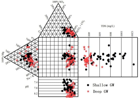 A Durov diagram (Durov 1948) was generated to examine the hydrochemical characteristics of groundwater in the study area (Figure 3). As shown in Figure 3, the majority of the deep groundwater samples have TDS less than 500 mg/L and HCO3− is the dominant anion. While the shallow groundwater samples had a larger variated range of TDS content varying from 300 mg/L to 1300 mg/L, also dominated by HCO3−. All the samples from both shallow and deep aquifers have similar concentration of cations. The larger variated range of TDS in shallow groundwater indicates that the quality of shallow groundwater is effected by evaporation and irrigated water infiltration. According to the Durov diagram, groundwater type in both shallow and deep aquifers in the area are mainly HCO3-Na·Mg·Ca, HCO3-Mg·Ca·Na, HCO3-Ca·Na, and HCO3-Na.