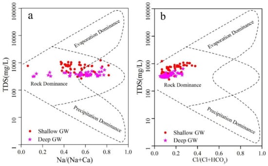 Understanding the main factors controlling groundwater chemistry is very important for groundwater sustainable development. For studying the formation mechanism of groundwater, Gibbs diagrams [], which divides the groundwater formation mechanism into rock, evaporation, and precipitation dominance, are used in the present study. As shown in Figure 4, all of the samples are plotted in the middle area of Gibbs diagrams, indicating that rock weathering is the main natural factor controlling groundwater chemistry in the study area. However, the trend of shallow groundwater samples, being plotted from rock dominance to evaporation dominance, indicating that evaporation is also responsible for shallow groundwater chemistry evolution in some degree []. It should be noted that Gibbs diagrams can analyze the main natural factors controlling groundwater evolution, but they are unable to identify the influence of human activities on groundwater chemistry.