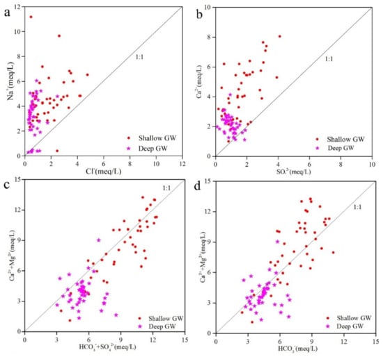 Cations and anions show significant difference in shallow and deep groundwater. As shown in Table 1, the concentrations of Na+, K+, Ca2+ and Mg2+ in shallow groundwater are observed in the ranges of 9.30–257 mg/L, 0.270–9.93 mg/L, 20.2–161 mg/L, 0.960–97.1 mg/L, respectively, and those in deep groundwater range within 6.40–139 mg/L, 0.240–5.14 mg/L, 22.2–82.6 mg/L, and 0.580–93.0 mg/L, respectively. For both shallow and deep groundwater, Na+ has the highest concentration value, followed by Ca2+ and Mg2+, and K+ has the lowest abundance. While the concentrations of Na+, Ca2+, and Mg2+ in shallow groundwater are much higher than that in deep groundwater. Due to the high abundance of those cations in wastewater and reclaimed water [], their use for irrigation results in elevation of the concentrations of Na+, Ca2+, Mg2+ in shallow groundwater []. The concentrations of HCO3−, SO42−, and Cl− in shallow groundwater range within 155–694 mg/L, 9.0–197 mg/L, and 12.3–167 mg/L, respectively. Those in deep groundwater are found in the range of 164–436 mg/L, 5.0–91.0 mg/L, and 8.80–86.2 mg/L, respectively. For both shallow and deep groundwater, the abundance of anions is in the following order: HCO3− > SO42− > Cl−. Also, a higher abundance of anions is observed in shallow groundwater.