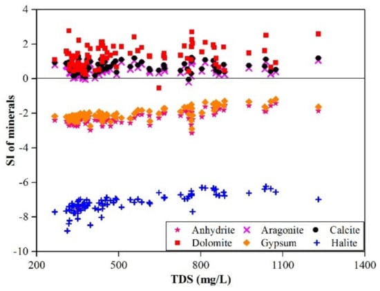 Relationships of saturation indices of selected minerals with total dissolved solids (TDS).