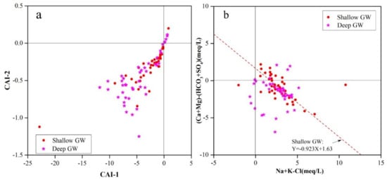 As shown in Figure 7a, about 94.25% of the samples had negative values of these two chloro-alkaline indices, indicating that exchange of Ca2+ with Na+ on aquifer materials (9) is the dominate cation exchange process in the study area. The bivariate diagram of (Ca2+ + Mg2+)-(HCO3− + SO42−) versus (Na+ + K+-Cl−) shows that most samples plot at lower right part of the diagram. It conforms a linear formula with the fitted slop of −0.923, confirming the existence of the exchange process expressed as R7. While the fitted slop is slightly lower than the theoretical value of −1, indicating that other processes also influence the concentrations of Na+, K+, Ca2+, and Mg2+ in groundwater [].