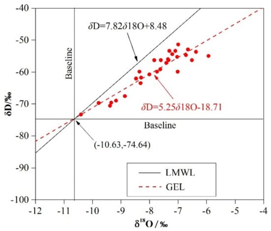 Evaporation is one of the important natural processes influencing groundwater chemistry in the study area. Deuterium and oxygen-18 isotopes are useful tools to get insight into the effect of evaporation on groundwater chemical composition. The relationship of δD and δ18O for shallow groundwater is plotted in Figure 8. As shown in Figure 8, all of the samples of shallow groundwater fall below the local meteoric water line (LMWL), as established by Song et al. [], indicating the strong evaporation effect on shallow groundwater chemistry in this area. A groundwater evaporation line (GEL), being expressed as (10), was obtained from shallow groundwater samples.