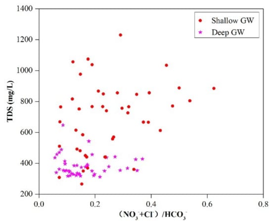 Human activities, such as wastewater effluents, irrigation, fertilizer application, and groundwater abstraction, have been found to have a great influence on groundwater quality [,,]. Due to the complexion and uncertainties of human activities, it is difficult to interpret the correlation between groundwater chemistry and human activities [,]. NO3− is one of the common contaminations related to human activities in groundwater, being widely used to study the influences of human activities on groundwater chemistry [,]. As shown in Figure 9, TDS in shallow groundwater has positive correlation with (NO3− + Cl−)/HCO3− and the pearson correlation coefficient is 0.303 (p < 0.05), indicating that shallow groundwater chemistry composition has been influenced by anthropogenic inputs []. While the correlation between TDS and (NO3− + Cl−)/HCO3− in deep groundwater is not obvious, demonstrating that human activities have rare influences on deep groundwater quality. When considering the long history of wastewater and reclaimed water irrigation, as well as fertilizer application, it is a common phenomenon that groundwater, especially shallow groundwater, have been polluted by anthropogenic pollutions [,,].