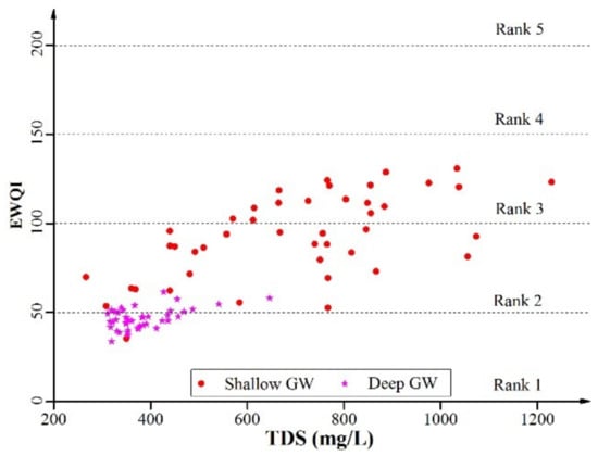 As shown in Figure 10, most deep groundwater samples are placed in the “excellent” quality (rank 1), and the majority of the shallow groundwater samples are located in “good” and “medium” quality (rank 2 and 3). Among 43 deep groundwater samples, 31 are “excellent” quality (rank 1) water samples, and 12 are of “good” quality (rank 2), accounting for 72.09% and 27.91%, respectively. Among 44 shallow groundwater samples, 1 is of “excellent” quality (rank 1), 25 are of “good” quality (rank 2), and 18 are of “medium” quality (rank 3), accounting for 2.27%, 56.82%, and 40.91%, respectively. The calculation results of EWQI indicate that deep groundwater in the study area is excellent for drinking purposes, while shallow groundwater, with the water quality mainly ranging from good to medium, is not as excellent as the deep groundwater for drinking purpose. The difference of water quality between shallow and deep groundwater also confirms that human activities and evaporation are the responsible factors, resulting in the relative poor quality of shallow groundwater.