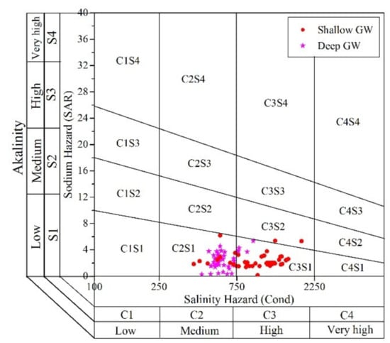 EC, a measure of the total salinity, is usually used to classify irrigation water quality. According to the criteria based on EC (Table 3), 86.36% and 13.64% of deep groundwater samples had EC values ranging from 250 μS/cm to 750 μS/cm and between 750 μS/cm and 2250 μS/cm, respectively (Figure 11), indicating good and acceptable quality for irrigation; and, 23.26% and 76.74% of shallow groundwater samples are with EC values in the range of 250–750 μS/cm and 750–2250 μS/cm (Figure 11), respectively, demonstrating good and acceptable quality for irrigation. The quality of deep groundwater is better than shallow groundwater for irrigation with respect to EC values.