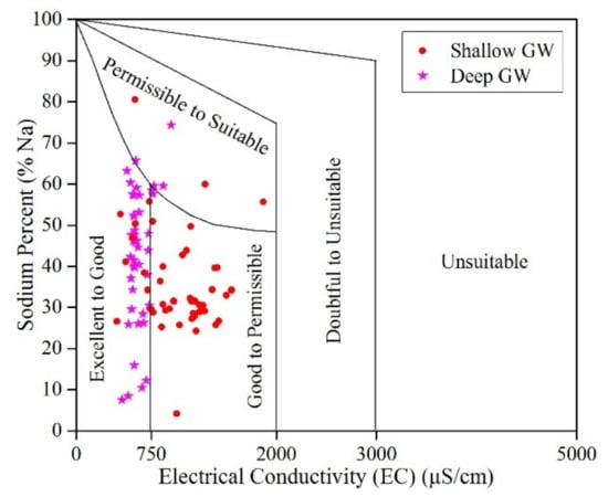 %Na is another important parameter to indicate the suitability of water for irrigation. It is calculated by (12). All the cations in Equation (12) are expressed in meq/L. According to the Wilcox diagram (Figure 12), 20.93%, 72.09%, and 6.98% of shallow groundwater samples belong to excellent to good, good to permissible, permissible to suitable categories for irrigation, respectively; and, most of the deep groundwater samples (88.64%) belong to the excellent to good category, while 4.55% and 6.82% belong to good to permissible and permissible to suitable categories, respectively.