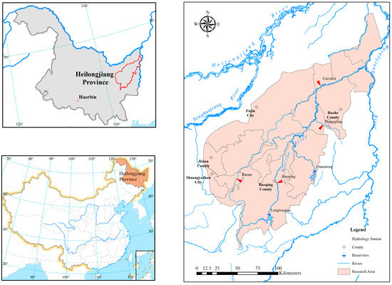 The Naolihe River is located in the east of Heilongjiang Province, China. It is the first tributary of the Wusulijiang River. The Naolihe basin has an area of 24,863 km2 with an elongated shape. The average basin length is about 270 km, and the average width is about 90 km. The ratio of length to width is 3:1. The Naolihe basin lies in the temperate continental monsoon climate zone. The multiyear average precipitation is 545 mm, and 70% of the precipitation is mostly concentrated in June, July, August, and September. Moreover, the precipitation in July and August accounts for about 44% of the total. The precipitation in May and June only accounts for 23%.