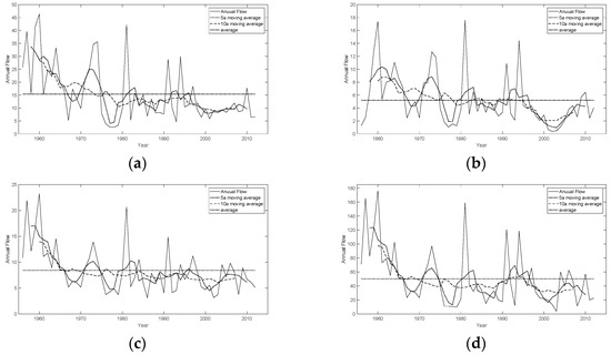 The results of the change in trend in the GI series obtained using the moving average method are shown in Figure 4; the moving average curve for the Hongqiling and Caizuizi stations showed a rising trend. In addition, slight fluctuations were observed in the moving average curves for the Baoqing and Baoan stations. Also, a downward trend exists in the mean annual flow curves shown in Figure 5. Additionally, GI is the index used to quantify and evaluate the evenness degrees of mean annual flow distribution, so there were different trends in GI curves and mean annual flow curves for the same station.