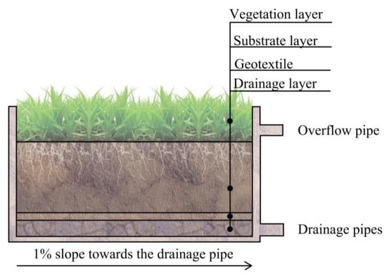 Green roofs mainly contain a vegetation layer, a substrate layer and a drainage layer, and are classified as either intensive green roofs or extensive green roofs (EGR) depending on the depth of the substrate layer [6,7]. Many previous studies have shown that one of the most important capabilities of green roofs is to reduce runoff [8,9,10,11]. Many factors affect the hydrological performance of green roofs, such as different substrate depth and plant cover [6,12,13,14].