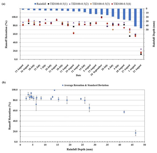 For the four TID100-0.5 modules: (a) runoff retention rates for 22 rainfall events and 6-h MIDPs (sorted by depth); (b) average retention rates and standard deviation for each event.