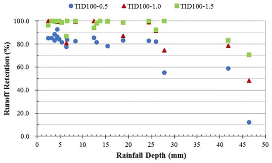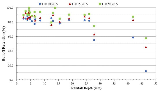 Rainfall–runoff data from 1 July to 30 September 2017 for TID100-0.5, TID150-0.5 and TID200-0.5 (Table 2) was analyzed to determine the effect of substrate depth (100, 150 and 200 mm) on runoff retention (Figure 5). The retention performance of TID200-0.5 was the best except in one rainfall event on 5 August 2017, in which TID100 had better retention performance than both TID150 and TID200 (Figure 5). The R3 of TID200 ranged from 57.6% to 100% (average of 89.1%) for the 22 rainfall events. The runoff retention of TID150-0.5 was basically consistent with that of TID200-0.5 but slightly lower for each rainfall event (average of 4.9%) than for TID200-0.5. The total cumulative runoff retention rates for TID100-0.5, TID150-0.5 and TID200-0.5 over the monitoring period were 66.6%, 77.6%, and 83.7%, respectively. In addition, when the rainfall depth increased gradually, the retention rates of TID150-0.5 and TID200-0.5 slowly decreased. The average R3 of TID150-0.5 was 5.4% higher than that of TID100-0.5, and TID200-0.5 was 4.8% higher than for TID150-0.5; that is, 10.2% higher than TID100-0.5. Many previous studies have obtained similar results [16,25,26,27]. Dusza et al. [26] found a strong difference in runoff retention for different substrate thicknesses.