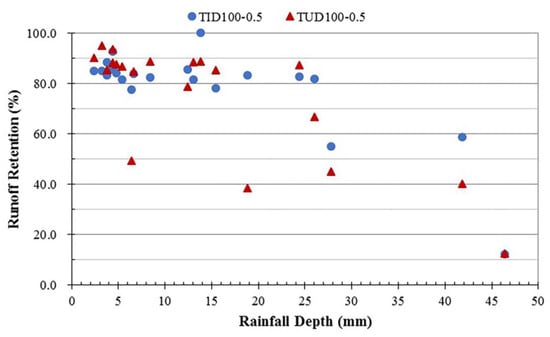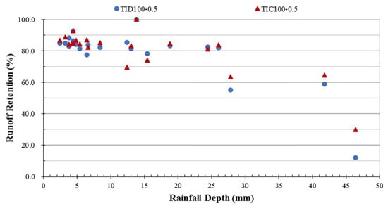 Rainfall–runoff data for modules TID100-0.5 and TIC100-0.5 were used to analyze the effect of their drainage layer materials on their runoff retention. The retention performance of both types of drainage layer was very similar for all 22 monitored rainfall events (Figure 6). The average absolute difference was 3.6% (17 events < 8.5% difference).
