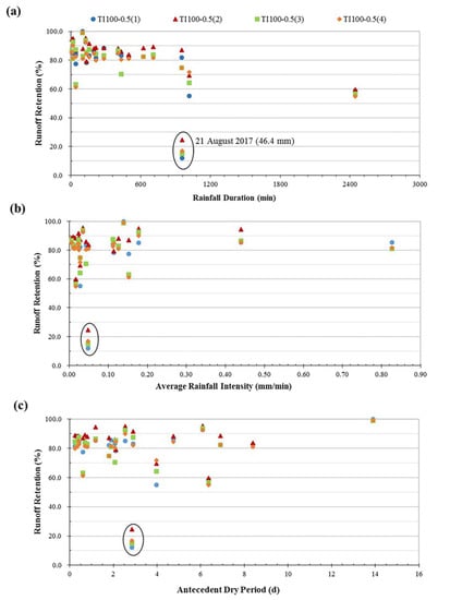 Rainfall retention rates for four TID100-0.5 EGR modules, for rainfall characteristics (a) rainfall duration; (b) average rainfall intensity; and (c) antecedent dry period.