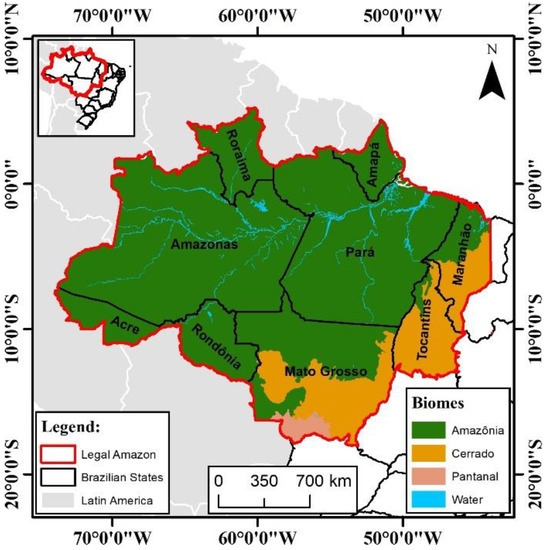 Location of the study area with the red line indicating the area of the Brazilian Legal Amazon, the black line are the political boundaries of Amazonian states and colours represent the different Brazilian biomes proposed by the Brazilian Institute of Geography and Statistics (IBGE) [35].