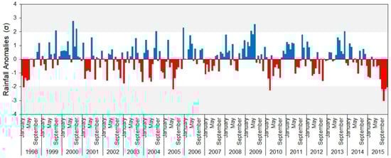 To investigate the amount of rainfall for each month in relation to the average (1998–2015), standard deviation normalized precipitation anomalies were calculated (Equation (1)) [14]. Previous studies have used this methodology to identify anomalies in historical series of environmental data, such as rainfall, fires, vegetation indices, and solar radiation [14,45,46].