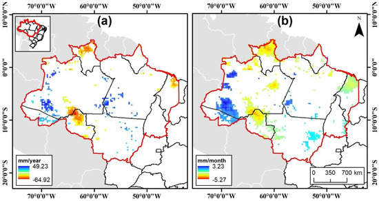 The findings presented here are represent an important contribution to the understanding of the recent spatial pattern of rainfall changes in the Brazilian Amazon between 1998 and 2015. The pixel-by-pixel positive and negative rainfall trends presented here have not been reported previously in the literature. In the Amazon, previous studies have projected the possibility of a drier climate with more frequent extreme drought events for the 21st century [12,100]. These projections were confirmed by recent observational studies [5,7,66,80]. Although no significant trends were found for annual and most of the monthly precipitation averages, significant local trends (pixel-by-pixel) found here suggest that rainfall changes are associated with recent extreme droughts and floods events that hit the Brazilian Amazon.